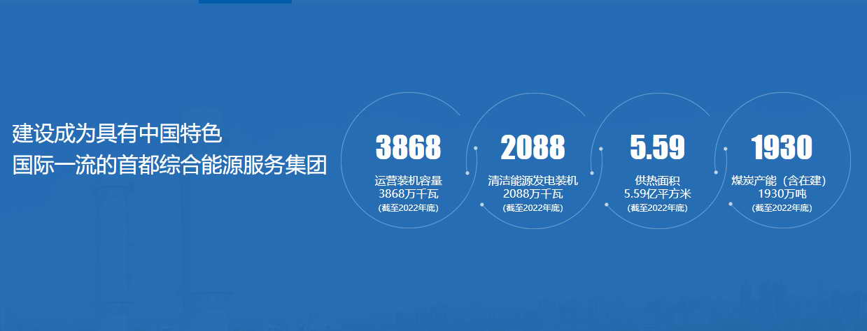 截至2021年底,集团资产规模达到4012亿元,净资产1420亿元;运营装机容量3434万千瓦,其中,清洁能源发电装机1720万千瓦,可再生能源发电装机1120万千瓦;煤炭产能1350万吨/年;供热面积5.18亿平方米,其中,北京市供热面积3.43亿平米,占首都核心区供热市场的80%以上。控股京能清洁能源、京能电力、昊华能源、京能置业、北京能源国际五家上市公司。